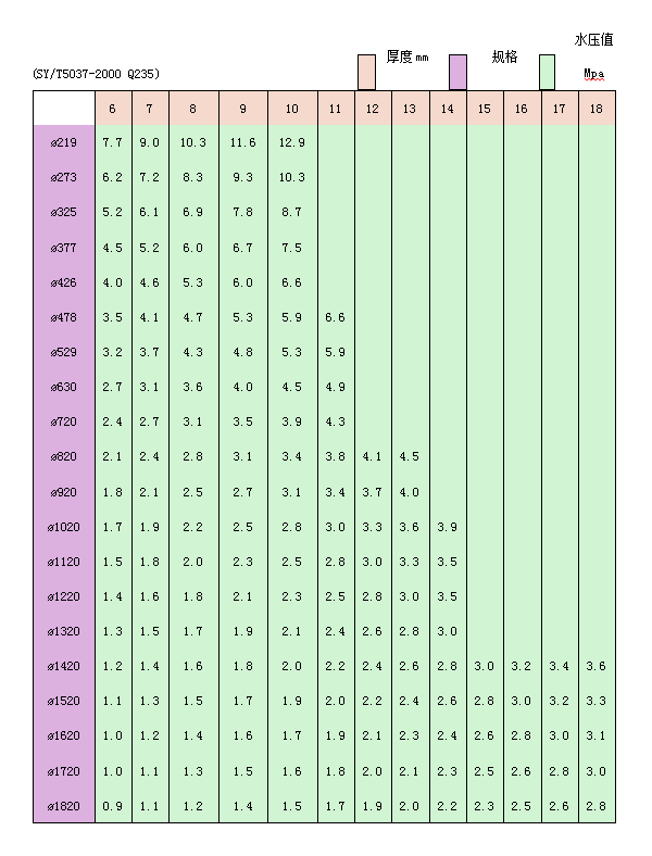 螺旋鋼管水壓值一覽表
