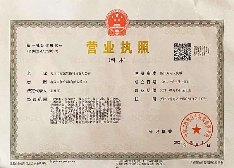 天津市友誠管道科技有限公司是專注從事管道以及管道防腐業(yè)務(wù)的大型公司,公司注冊資金5000萬元,位于中國管道生產(chǎn)基地-天津靜海大邱莊工業(yè)區(qū),近靠京滬高速公路、津石高速公路、津滄高速公路,距高鐵天津南站35公里,天津國際機(jī)場60公里,為客戶來訪及業(yè)務(wù)發(fā)展提供了便利的交通條件。